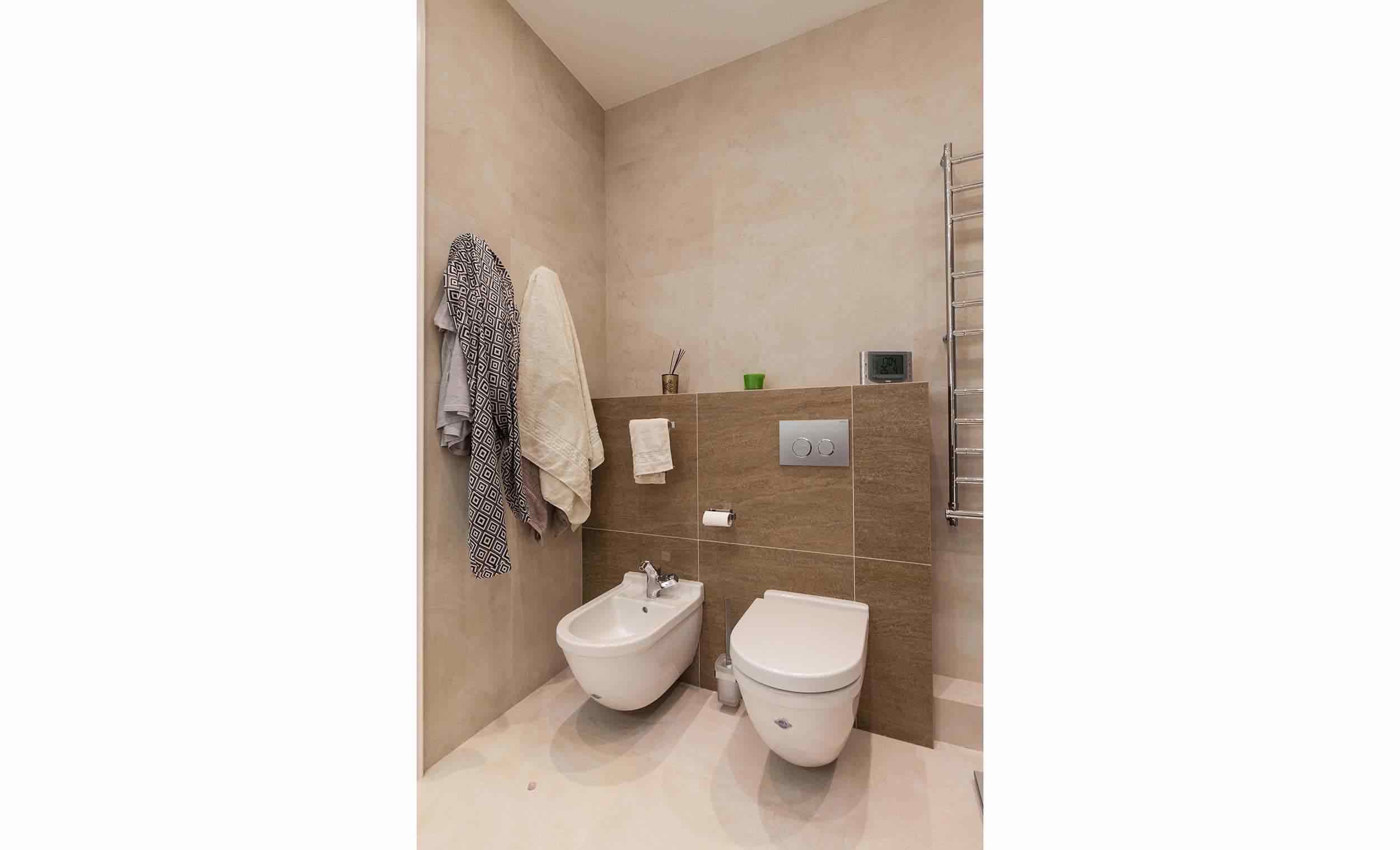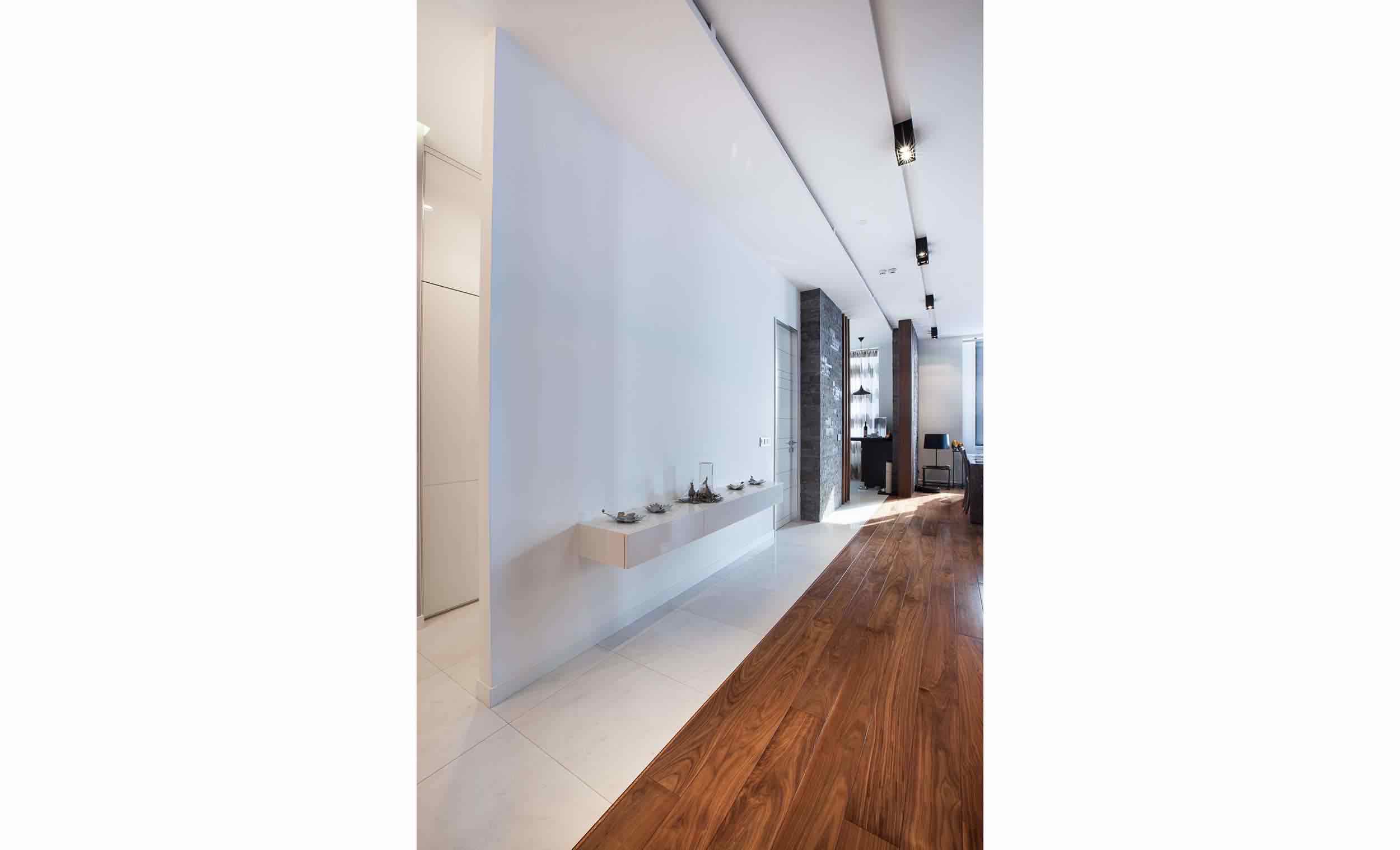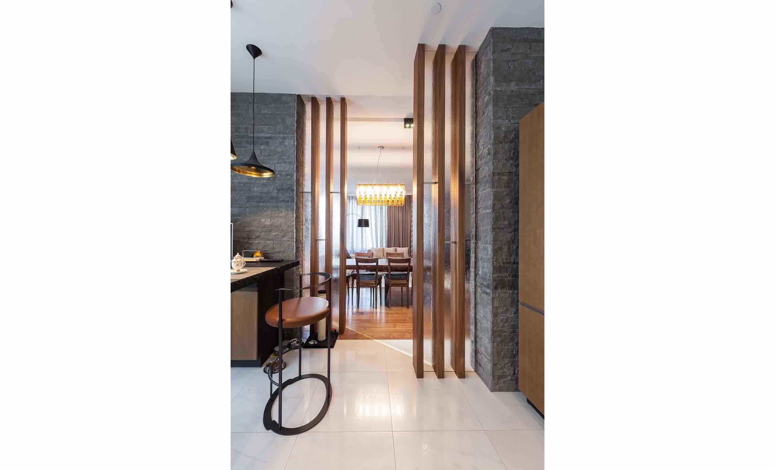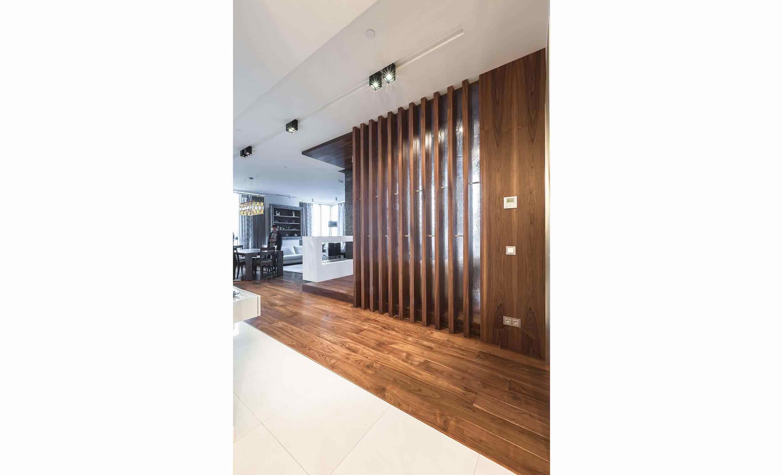 Realizujući želje klijenta, arhitekta je izabrao prirodne materijale, koji uvek izgledaju dostojno u enterijeru: drvo oraha, sa lepom i izražajnom teksturom i prirodni kamen, tamno sive boje – mramorizovani krečnjak. Mokre zone su obložene granitnom keramikom, sa mermernom teksturom.