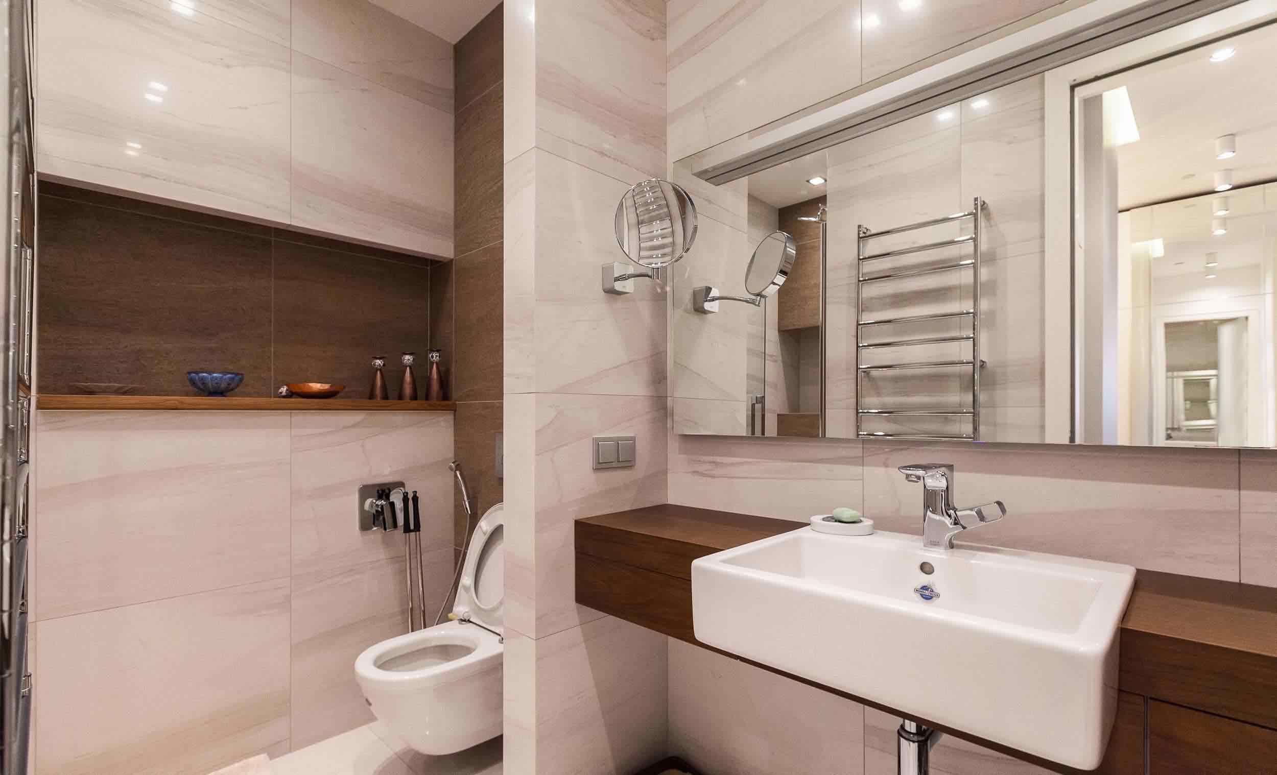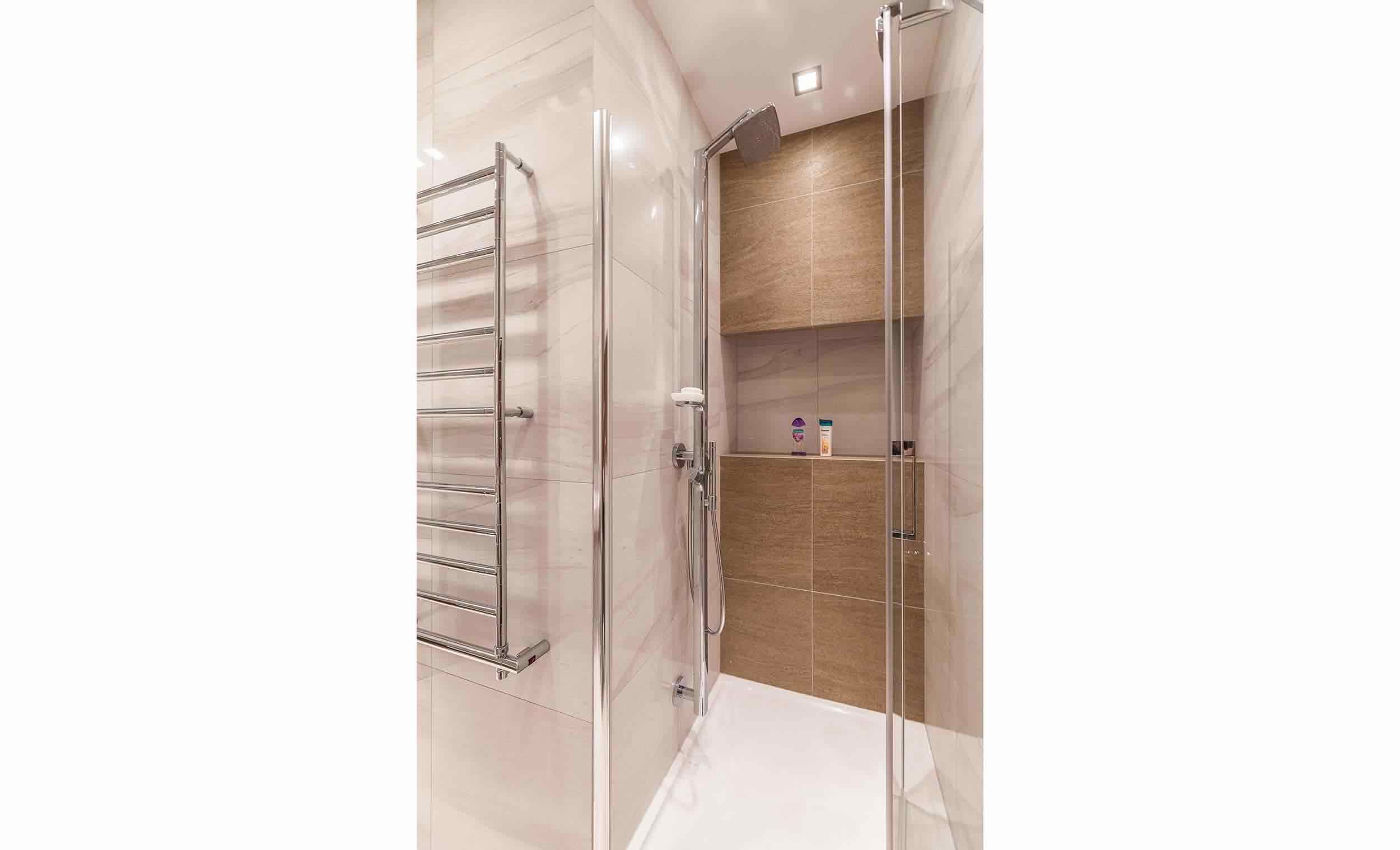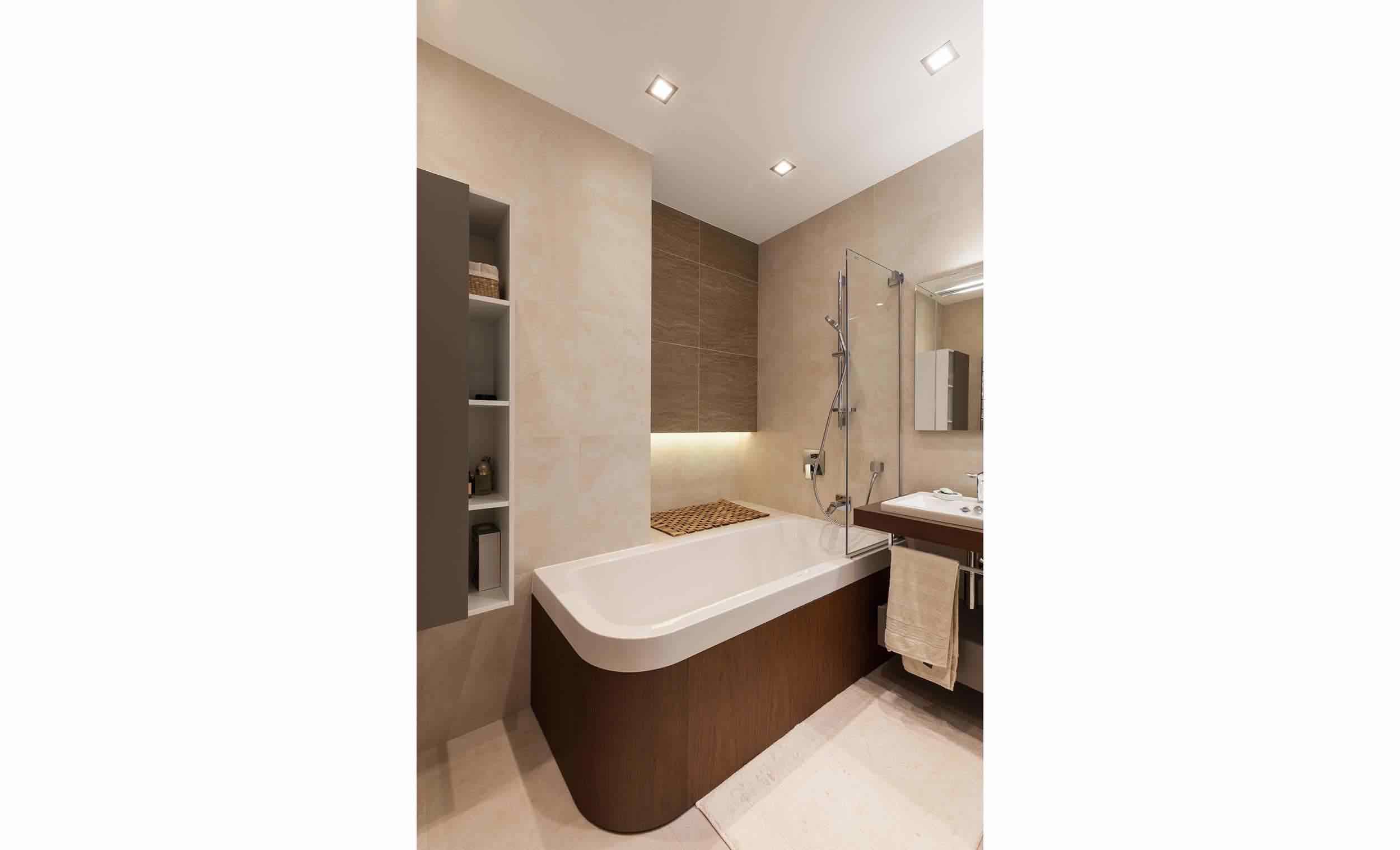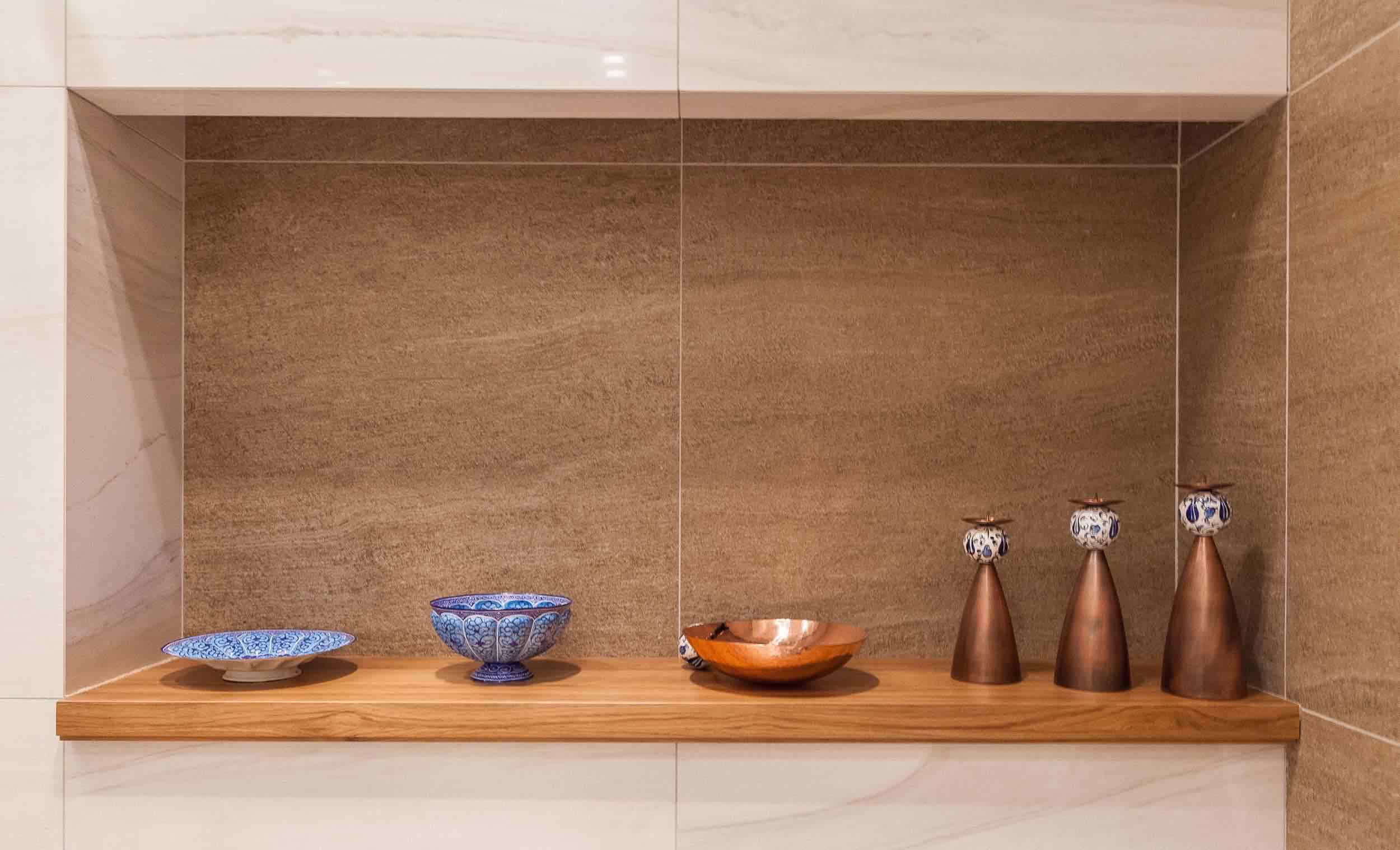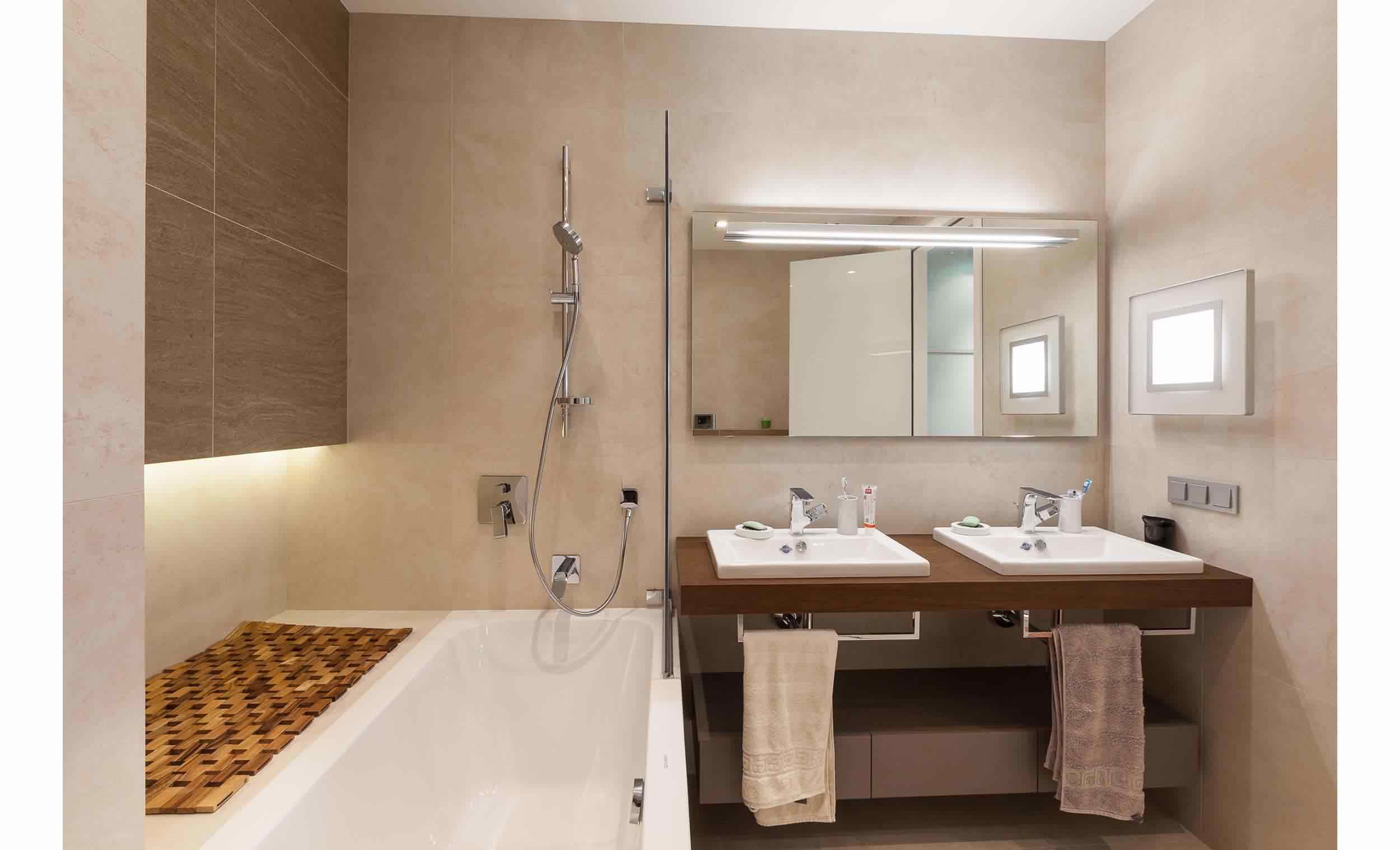 Realizujući želje klijenta, arhitekta je izabrao prirodne materijale, koji uvek izgledaju dostojno u enterijeru: drvo oraha, sa lepom i izražajnom teksturom i prirodni kamen, tamno sive boje – mramorizovani krečnjak. Mokre zone su obložene granitnom keramikom, sa mermernom teksturom.