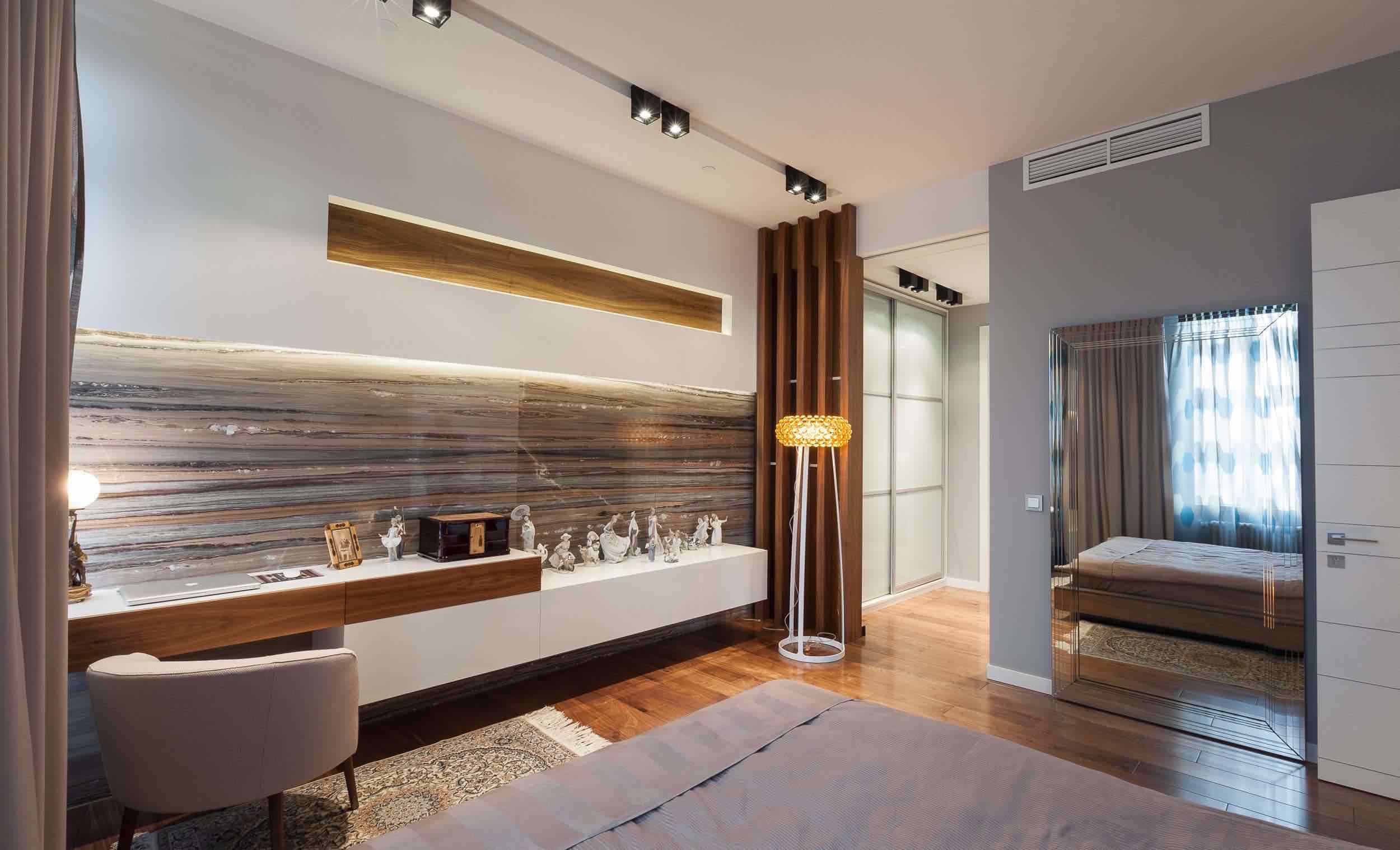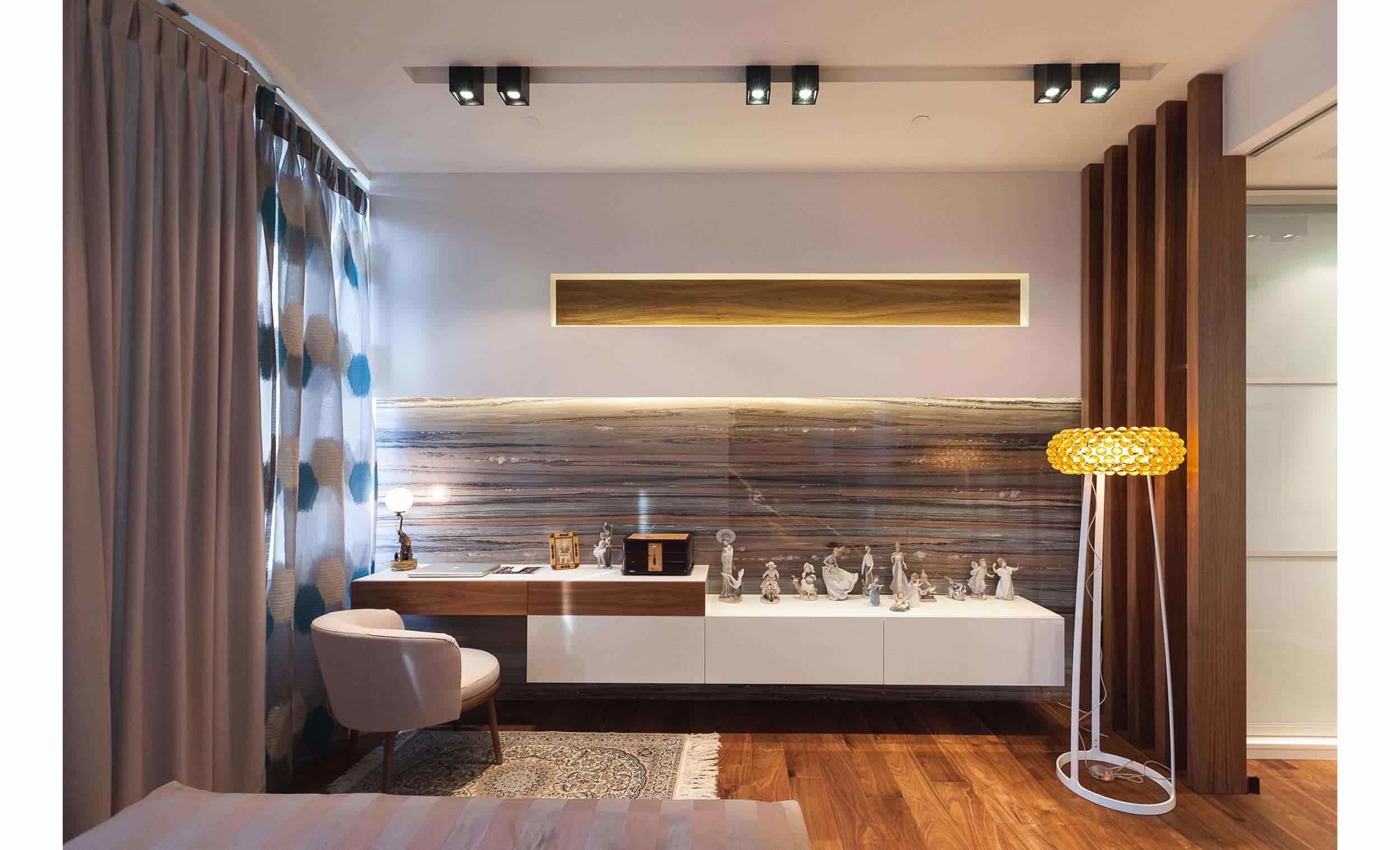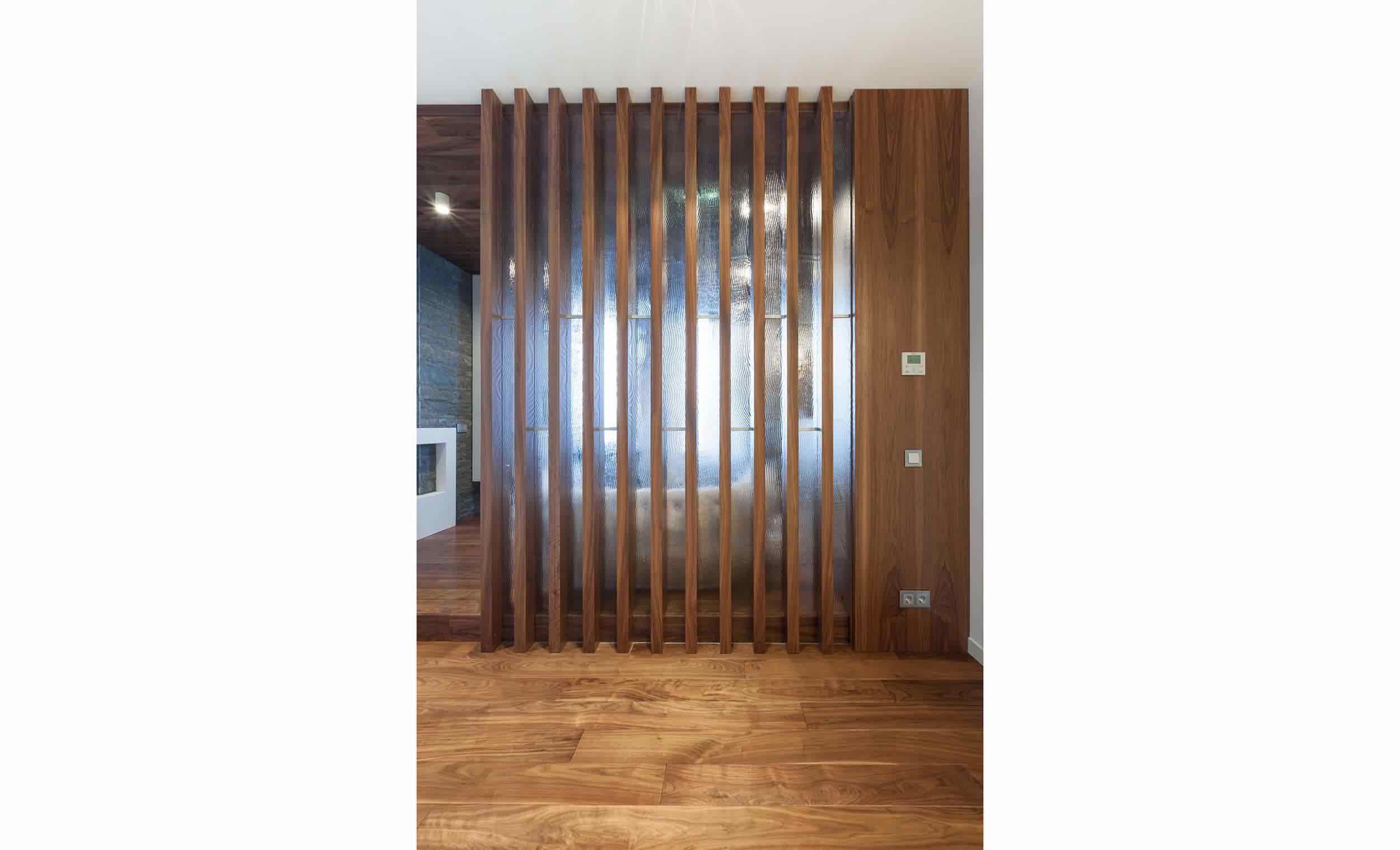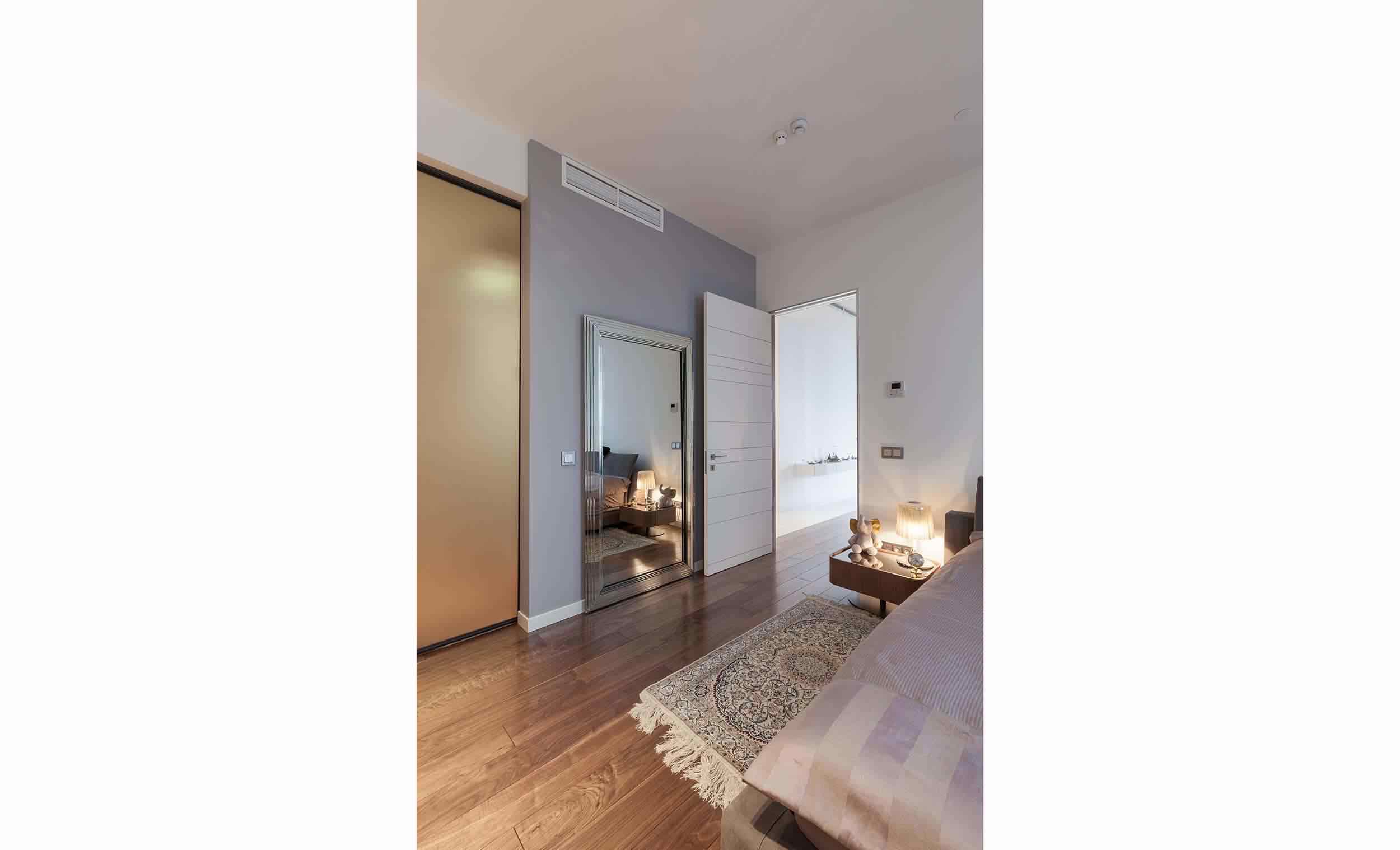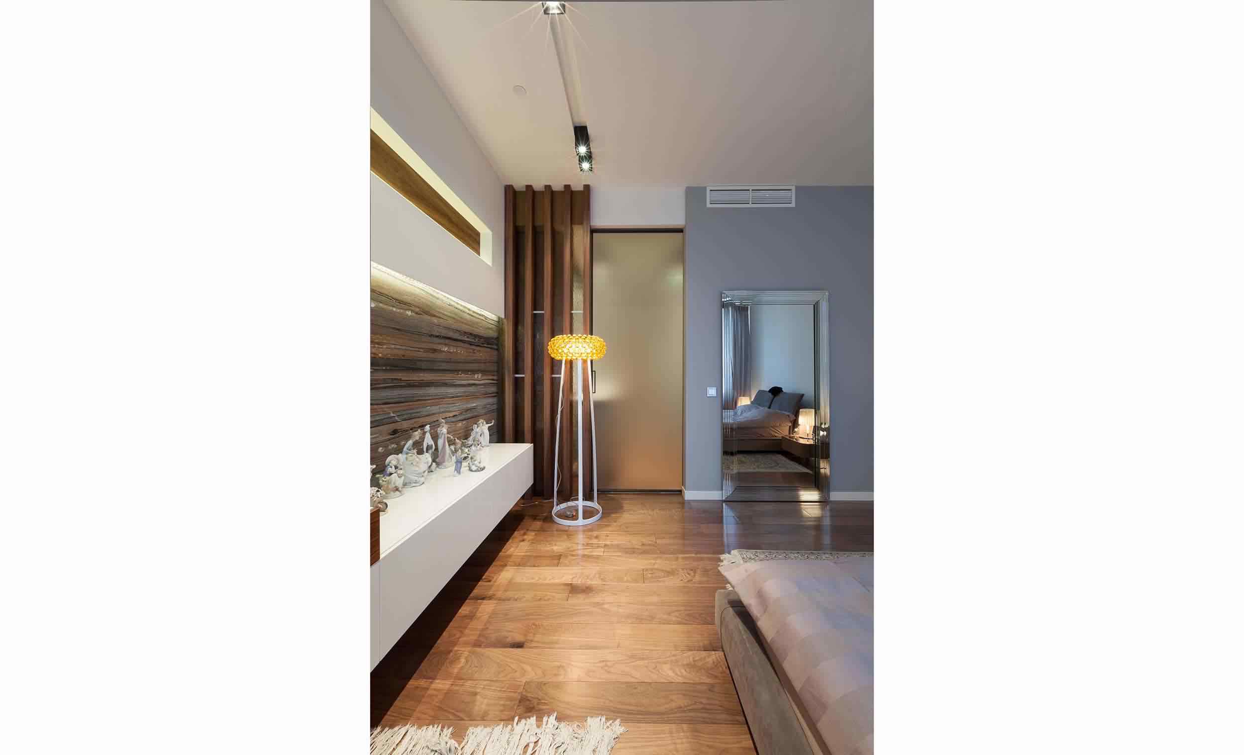 Od dnevne zone odvojena je spavaća soba, koja je kroz prolaznu garderobu povezana sa kupatilom. Spavaću sobu i garderobu razdeljuje drveno-staklena pregrada, koja predstavlja motiv, koji se ponavlja u dizajnu stana.